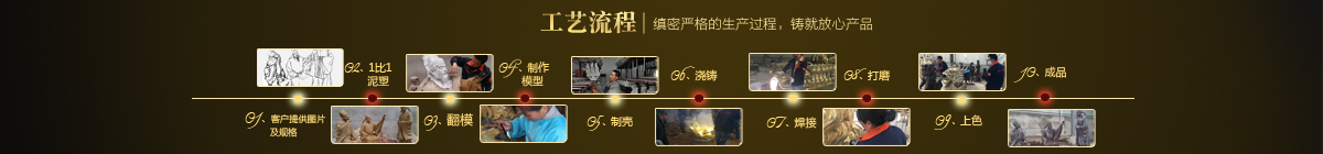制作一件完美的鑄銅雕塑,最重要的步驟就是制作泥塑模型,然后再用工業(yè)硅膠拓印、翻模。所以泥塑的姿態(tài)、神情生動與否直接影響最終銅雕塑的品質(zhì)。所以我廠一直對泥塑模型的制作格外重視。我廠以雕塑為本,以藝術(shù)為根,挾中華文化之傳統(tǒng),偕歐陸藝術(shù)之風(fēng)韻,風(fēng)格獨特,盡顯淋漓盡致。我們本著大膽創(chuàng)新、勇于突破的精神,以追求卓越為導(dǎo)向,堅持寧缺勿濫為原則,并可依照您提供的要求,為您量身設(shè)計制作。我廠人才濟濟,有智慧嚴謹?shù)墓芾戆嘧樱姸嗄贻p充滿激情、充滿創(chuàng)意的專業(yè)設(shè)計團隊、有專業(yè)技術(shù)精湛的雕塑制作人才和專業(yè)的施工隊伍。他們不僅具深厚的文化藝術(shù)底蘊,更汲取當代雕塑精華,博采眾家之長,作品既有嚴肅莊重寫實題材,也有輕松前衛(wèi)的抽象題材,表現(xiàn)手法上浪漫主義中不乏樸實,現(xiàn)實主義中蘊涵著激情,設(shè)計理念貫穿古今、融匯中西,深刻詮釋著藝術(shù)的精髓,把古典主義和后現(xiàn)代主義完美的融合,將雕塑藝術(shù)演繹為力的凝聚、美的體現(xiàn),讓人們感受到的不僅是一種藝術(shù)的浪漫與優(yōu)雅、粗獷與悲壯、更是豐富的優(yōu)秀藝術(shù)寶藏和文化傳統(tǒng),讓您在藝術(shù)與文化中穿流,在時空中飄蕩,使靈魂在藝術(shù)的海洋洗禮。 MORE+
